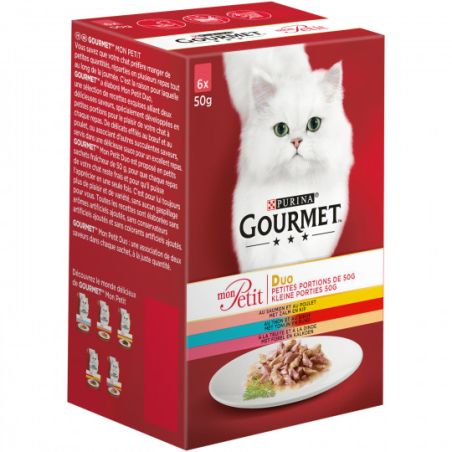 Vous savez que votre chat préfère manger de petites quantités, réparties en plusieurs repas tout au long de la journée. C’est pourquoi GOURMET a élaboré Mon Petit Duo, une sélection de recettes exquises alliant deux délicieuses saveurs, spécialement développées en petites portions pour le plaisir de votre chat à chaque repas. De délicats émincés au bœuf et au poulet, ou associant d’autres succulentes saveurs, saisis dans une délicieuse sauce pour un excellent repas. GOURMET Mon Petit Duo est proposé en petits sachets fraîcheur de 50g, pour que chaque repas de votre chat reste frais et pour qu’il puisse l’apprécier en une seule fois. C’est pour lui toujours plus de plaisir et de variété, sans aucun gaspillage pour vous.